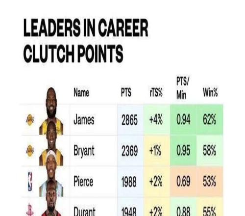 最近看到一个得分榜,很有意思,叫关键时刻得分榜,可以看到,詹姆斯以2865分断层登顶的数字,再次给“关键先生”定义...