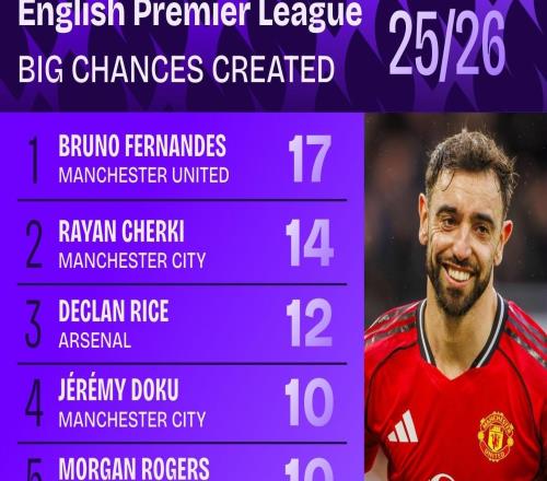 据足球数据网站Squawka的统计,本赛季至今,布鲁诺-费尔南德斯在英超已创造17次重大机会,领跑榜单,谢尔基14次、赖...