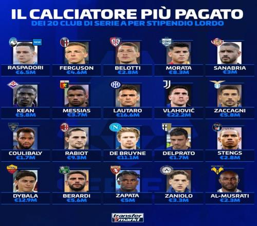 北京时间2月17日,德转统计出了本赛季意甲20家俱乐部各自队内的顶薪球员,其中尤文图斯前锋弗拉霍维奇以税前222...