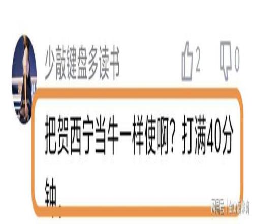 全场打满40分,如此超负荷运转,也让球迷们心疼不已。“把贺希宁当牛一样使啊?打满40分钟。”;“生产队的驴都不带这么用的”;“牛都不敢这样用啊。真牛逼”;“老贺每场都这么用要不得,赛季漫长,这么用迟早要出问题的。一旦老贺伤了,有深圳队哭的时候,唉!”……