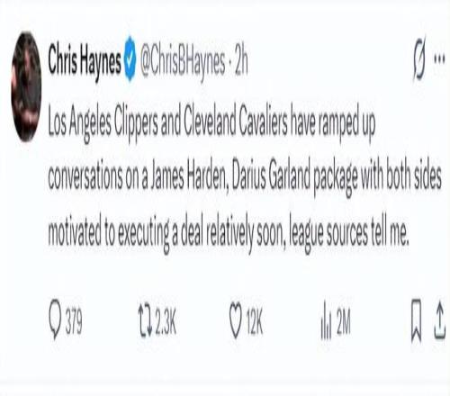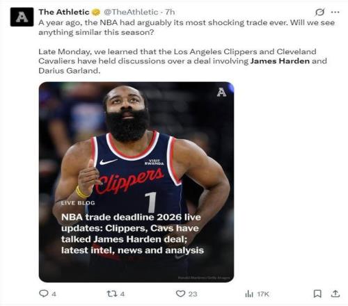 北京时间2月4日,据知名记者沙姆斯·查拉尼亚报道,NBA交易市场完成一笔引人关注的交易:洛杉矶快船队将詹姆斯·哈登送至克利夫兰骑士队,换回后卫达里厄斯·加兰和一个2026年的次轮选秀权,这笔涉及全明星后卫互换的交易,标志着两支球队在赛季中期选择了不同的发展路径。