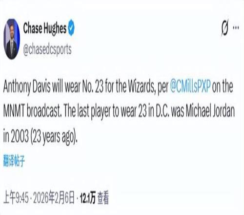 北京时间2月6日,奇才和独行侠的交易官宣,安东尼-戴维斯正式成为一名奇才球员。奇才队记Chase Hughes报道称,浓眉来到奇才将改穿23号球衣,而上一位在奇才穿23号球衣的球员,已经追溯到23年前的迈克尔-乔丹(2003年)。