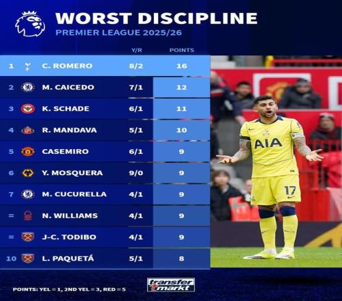赛后来自德转的统计指出,克里斯蒂安-罗梅罗是本赛季至今英超联赛中拿牌数量最多的球员,21场比赛这名阿根廷中卫一共吃到了8张黄牌和2张红牌。