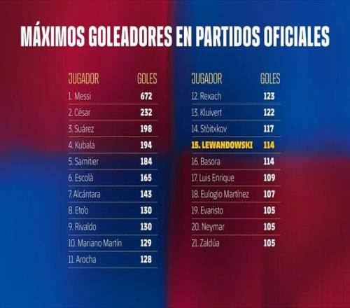 114球,莱万升至巴萨队史射手榜第15位