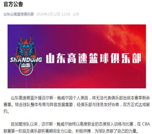 山东男篮外援鲍威尔因个人原因,将无法代表俱乐部出战本赛季剩余赛事。结合球队整体布局与阵容发展需要,经俱乐部与球员友好协商,双方正式达成解约。