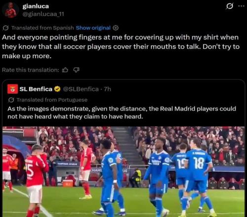普雷斯蒂安尼的行为引起轩然大波,本菲卡官方在社交媒体发布了一段比赛切片视频,并表示皇马球员不可能听到他们认为的本菲卡球员说的内容。
