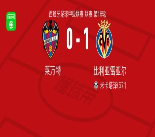 北京时间2月19日西班牙足球甲级联赛 联赛 第16轮,莱万特主场对阵比利亚雷亚尔。比利亚雷亚尔米卡塔泽破门。最终比分莱万特 0-1 比利亚雷亚尔。