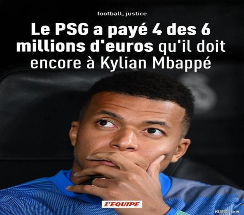 据《队报》的最新报道,巴黎圣日耳曼已经支付了姆巴佩约600万欧元欠薪中的400万欧元,此外他们希望通过协商取消另一项惩罚:在官网首页公示整份判决书一个月。