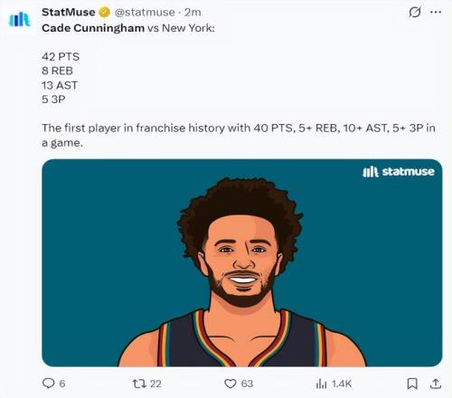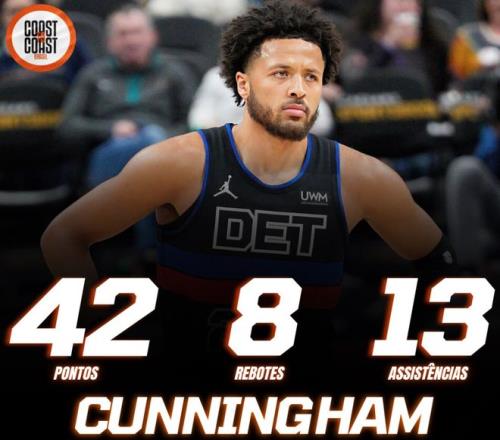 此役后坎宁安一战创造多项纪录:1.他成为活塞队史85年首位单场40+10+5+5三分的球员;