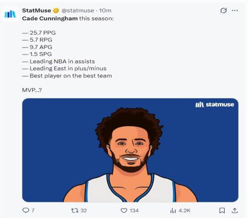 数据媒体晒出坎宁安本赛季场均25.7分5.7篮板9.7助攻1.5抢断,他的助攻领跑联盟,正负值领先东部,他是球队最出色的球员,力挺他拿MVP。