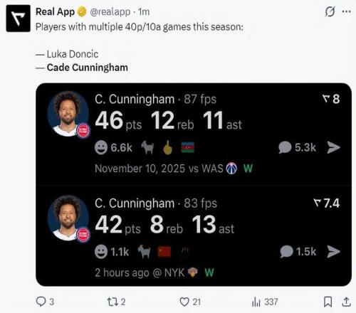 3.赛季有多场40+10助攻的球员只有东契奇、坎宁安;