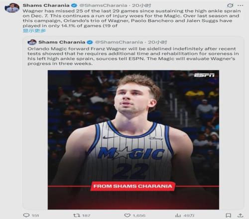 据NBA名记Shams报道,魔术球星弗朗茨-瓦格纳因脚踝高位扭伤,无限期缺阵,三周后接受重新评估。由于左脚踝高位扭伤,过去29场比赛,小瓦格纳缺席了25场。从上赛季至今,小瓦格纳、班凯罗和萨格斯,仅仅合体打了19场。